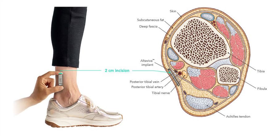 The Altaviva device dispatches gentle electrical pulses to the tibial nerve and then the brain through this communication pathway. These pulses help restore communication between the bladder and the brain, with the aim of reducing sudden urges to urinate and leaks.